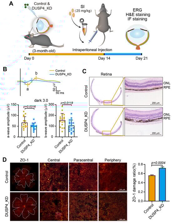 To assess the impact of DUSP4_KD on retinal structure and function, OCT and IF staining of ZO-1 were performed to detect retinal structure, and ERG was performed to detected visual function. OCT analysis revealed no significant differences in the thicknesses of the retina, outer nuclear layer (ONL), or RPE/photoreceptor between the control and DUSP4_KD groups (Figure S2A). Similarly, IF staining of ZO-1 showed no apparent alterations in RPE morphology or structure integrity in DUSP4_KD mice (Figure S2B). However, ERG recordings indicated a modest but consistent reduction in both a-wave and b-wave amplitudes in DUSP4_KD mice, suggesting a subtle impairment in visual function despite preserved retinal structure (Figure S2C).