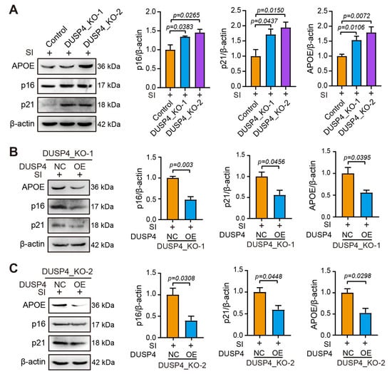 Total protein was recovered from cell lysates in the presence of protease inhibitors (BOSTER, AR1182-1, Wuhan, China). Protein concentrations were determined with a BCA protein assay kit (Yeasen, 20201ES, Shanghai, China). The protein samples were denatured in a hot water bath before being resolved on a 10–12% gradient gel via sodium dodecyl sulfate–polyacrylamide gel electrophoresis at 80 V for 90 min and then 220 mA for 60 min. The separated proteins were transferred to polyvinylidene difluoride (PVDF) membranes (Bio-Rad, 1620177, Philadelphia, PA, USA). First, the membranes were blocked with 5% dried skim milk (Beyotime, P0216) in 1× Tris-buffered saline (Aladdin, T431531)-0.1% Tween 20 (Beyotime, ST1726). Next, primary antibodies were added, and the mixture was gently agitated for 2 h at room temperature or overnight at 4 °C. DUSP4, p16, p21, APOE, p53, p38, p-p38, NF-κB, and p-NF-κB expression was analyzed using previously described antibodies, with b-actin or GAPDH serving as an internal control. Finally, images were captured with a ChemiDox XRS imaging system (Bio-Rad) using an enhanced chemiluminescence (ECL) immunoblot kit. ImageJ was used to analyze the band density.