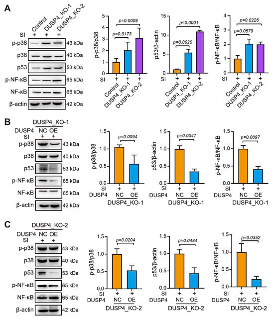 DUSP4 downregulated the p38, p53, and NF-κB signaling pathways. (A). p-p38, p53, and p-NF-κB expression in DUSP4_KO cell lines. (B). DUSP4 overexpression attenuated p-p38, p53, and p-NF-κB expression in DUSP4_KO-1 cells. (C). DUSP4 overexpression attenuated p-p38, p53, and p-NF-κB expression in DUSP4_KO-2 cells. Band density was quantified using ImageJ 1.48. Statistical significance was determined by using the unpaired t-test.