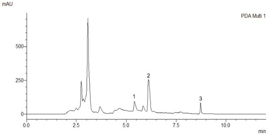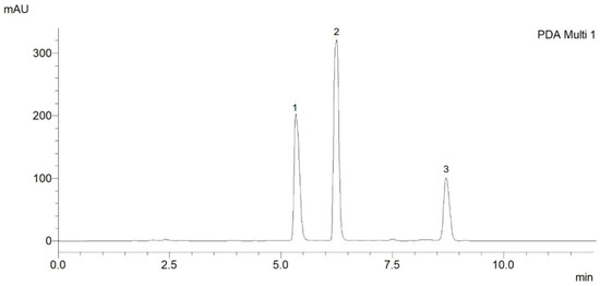 Representative HPLC-PDA chromatogram of the mixture of the three ecdysteroids, where 1—TU (40 µg/mL), 2—20E (40 µg/mL), and 3—PA (40 µg/mL).