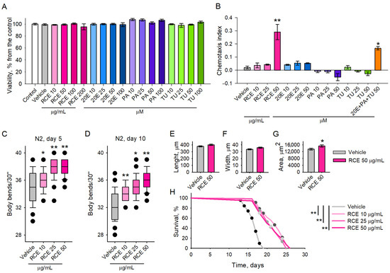 Treatment with RCE stimulates the chemosensory network, improves the motility, and increase the lifespan of C. elegans. (A) Viability test upon RCE (10–200 μg/mL), 20E, PA, and TU (10–100 μM) in C. elegans (n = 1500) compared to control group. (B) Chemotaxis assay on C. elegans treated with RCE, 20E, PA, TU (10, 25, 50 μM), and combination of 20E, PA, and TU (50 μM; n = 300–600). (C,D) The mobility of RCE-supplemented worms (10, 25, and 50 μg/mL) on day 5 and day 10, presented as bending movements within 30 sec and compared to vehicle group (n = 45). (E) Mean length, (F) width, and (G) area were measured and analyzed using the WormLab software (version 2023.1.1; n = 110–130). Data for (A–H) are presented as mean ± SEM. For (A–D), significance between the groups was assigned as * p < 0.05, ** p < 0.01 compared to the vehicle group, as determined by one-way analysis of variance (ANOVA). Statistical differences between data in (E–G) were evaluated by the Mann–Whitney rank sum test with * p < 0.05. (H) Lifespan of RCE-treated worms (10, 25, and 50 μg/mL), compared to vehicle group, presented as a Kaplan–Meier survival curve (n = 90) expressed as the fraction of survival. The log-rank test was used to evaluate the statistical significance between the experimental groups. For each group, n consisted of a specified number of worms per treatment group, with 3 independent biological replicates.