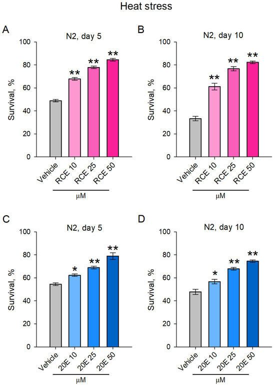 The RCE and 20E treatment improved heat stress resistance in C. elegans. Worms were subjected to treatment with RCE (10, 25, and 50 μg/mL; (A,B) and ecdysterone (20E—10, 25, and 50 μM; (C,D). Thereafter, both 5-day-old (A,C) and 10-day-old (B,D) nematodes were exposed to acute heat stress at 37 °C for 2 h. The viability was monitored after a recovery period of 20 h. The results were represented as percentage survival as mean ± SEM, n = 90 (30 worms per group, 3 biological replicates), * p < 0.05, ** p < 0.01 (one-way ANOVA).