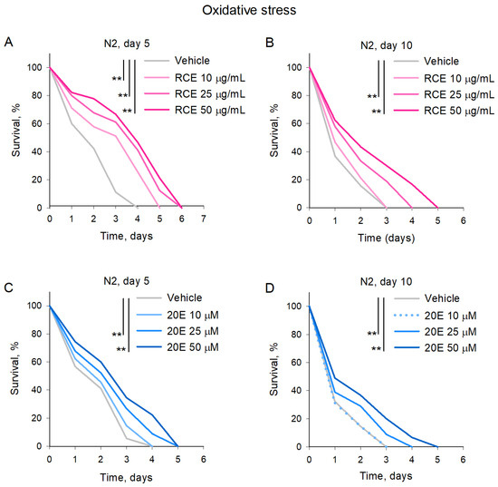 The RCE and 20E treatment improved oxidative stress resistance in C. elegans. Wild-type N2 strains of C. elegans were subjected to RCE treatment at concentrations of 10, 25, and 50 μg/mL (A,B) and 20E at concentrations of 10, 25, and 50 μM (C,D). Both 5-day-old (A,C) and 10-day-old (B,D) worms were exposed to paraquat (50 mM). The viability of the worms was monitored at 24 h intervals. Data were analyzed using Kaplan–Meier analysis, and p values were calculated using the log-rank test, n = 90 (30 worms per group, 3 biological replicates), ** p < 0.01.
