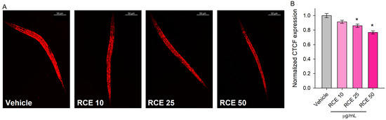 The results revealed a significant decrease in lipid accumulation in C. elegans treated with 50 and 100 μg/mL RCE (Figure 6A,B).