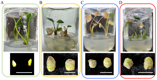 Expansion of taro corms induced by ABA and high sucrose concentrations for test-tube plantlets and taro corms in different media after 90 d. The top row shows the test-tube plantlets, and the bottom row shows the taro corms. (A) The TBM10 medium was unable to induce taro corm. (B) The TBM14 medium induced taro corms. (C) The TBM15 medium induced small taro corms, but the test-tube plantlets withered. (D) The TBM16 medium induced small taro corms. Bar = 1 cm.