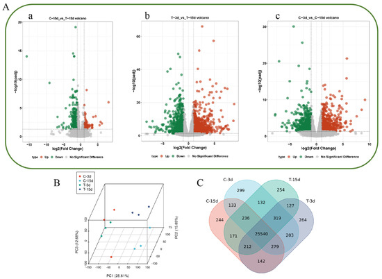 Transcriptome analysis of taro corm expansion. (A) Volcano plot of DEGs: C15 vs. T15 (a), T3 vs. T15 (b), and C3 vs. T15 (c). (B) PCA of gene expression in various taro samples. (C) Venn diagram illustrating gene expression analysis in different taro samples.