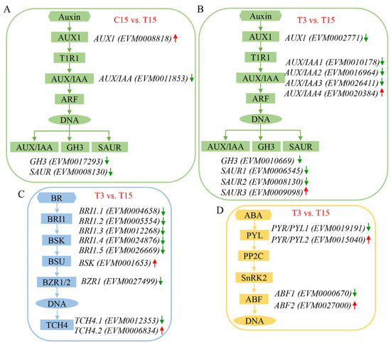 Analysis of plant hormone signal transduction during taro corm expansion. The red arrow on the right indicates an increase in gene expression, and the green arrow indicates a decrease. (A) DEGs related to auxin signal transduction in C15 vs. T15. (B) DEGs related to auxin signal transduction in T3 vs. T15. (C) DEGs related to brassinosteroid signal transduction in T3 vs. T15. (D) DEGs related to abscisic acid signal transduction in T3 vs. T15.