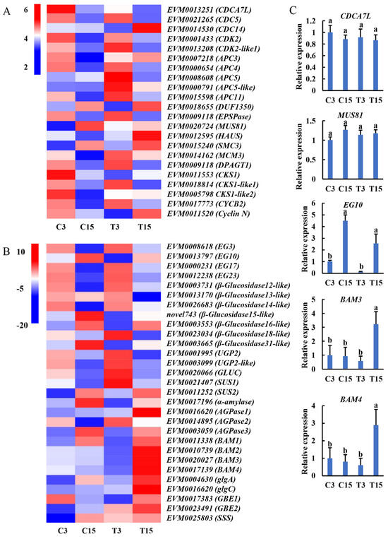 Here, we identified genes related to the cell cycle, sugar transfer, and starch metabolism. In the process of taro expansion, genes related to cell division and cell cycle were highly expressed in C3 or T3 and gradually decreased in the later stage (Figure 5A). Previous studies have shown that in the early stage of tuber formation, many cells divide and proliferate [12]. Similarly, in the starch and sugar metabolism pathway, genes related to sucrose metabolism were expressed at C3 or T3, whereas genes related to starch synthesis were highly expressed at C15 or T15. Starch is the main form of starch found in tubers. In the process of tuber expansion, sucrose is converted into starch and accumulates in cells, resulting in tuber expansion. Moreover, the endoglucanase, glucosidase, UGPase, and SUS genes were upregulated in C3 vs. T3, whereas amylase, AGPase, β-amylase (BAM), the glycogen branching enzyme gene (GBE), and the soluble starch synthase gene (SSS) were highly expressed in C15 vs. T15 (Figure 5B). These results showed that 5 μM ABA induced taro tuber swelling and starch synthesis.