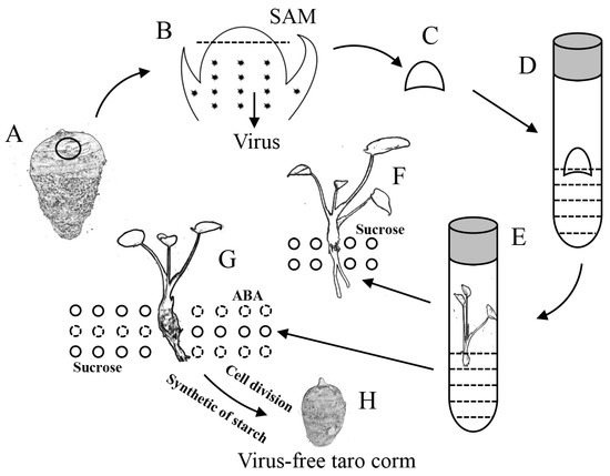 represents the taro virus, and the area above the dotted line was used to induce adventitious shoots. (C) The shoot apical meristems for inducing adventitious shoots. (D) The shoot apical meristem was cultured in vitro. (E) The shoot apical meristem was cultured into adventitious shoots, and an RT-PCR assay was used to verify the elimination effect. (F) Adventitious shoots only grow roots in 3% sucrose conditions, and the solid circles represent sucrose. (G) Adventitious shoots induced taro corms in 8% sucrose or 3% sucrose + 5 μM ABA conditions; the solid circles represent sucrose, and the dotted circles represent ABA. (H) The virus-free taro corm, which is easy to transport and store.