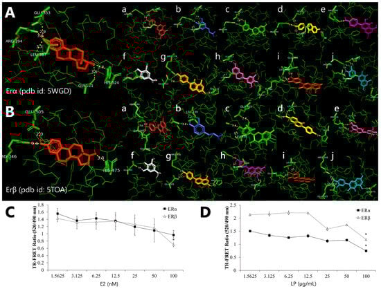 Representation of the binding interaction of Labisia pumila var. alata (LP) phytochemicals with (A) oestrogen receptor alpha (ERα) (PDB ID: 5WGD) and (B) oestrogen receptor beta (ERβ) (PDB ID: 5TOA), which was previously re-docked with 17β-oestradiol. All phytochemicals were compared with 17β-oestradiol, which is in red. Alphabetical order, (a) apigenin, (b) caffeic acid, (c) catechin, (d) daidzein, (e) epigallocatechin, (f) gallic acid, (g) genistein, (h) kaempferol, (i) myricetin, and (j) quercetin. The competitive binding affinity of ERα and ERβ using (C) 17β-oestradiol (E2) and aqueous (D) LP extract at various concentrations. Figures are selected as representative data from three independent experiments. Results are expressed as mean ± SD values. * p < 0.005 (vs. starting concentration, 1.5625 µg/mL).