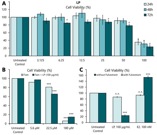 The effect of LP on MCF-7 cell proliferation. (A) The effect of aqueous LP extracts on MCF-7 cell proliferation rates after 24, 48, and 72 h of incubation. (B) The effect of LP aqueous extract on tamoxifen-treated MCF-7 cells. (C) The effect of 17β-oestradiol (E2) and LP extract on MCF-7 cells with and without 100 nM Fulvestrant supplementation. The cell proliferation rate at each concentration was calculated as a percentage of the untreated control. Figures are selected as representative data from three independent experiments. Results are expressed as mean ± SD values. * p < 0.005 (vs. untreated control). *** p < 0.005 (vs. untreated control), ^^ p < 0.005 (vs. without Fulvestrant).