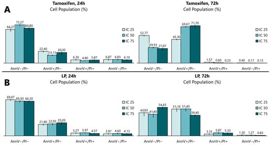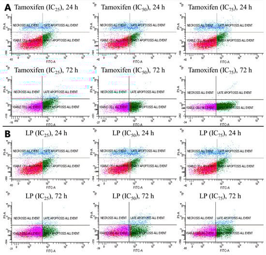 Cells were treated with tamoxifen (A) and LP (B) at indicated times (24 and 72 h) and concentrations (IC25, IC50, and IC75) and then were co-stained with PI and annexin V-FITC. The translocation of phosphatidylserine was detected using flow cytometry after both tamoxifen and LP treatment.