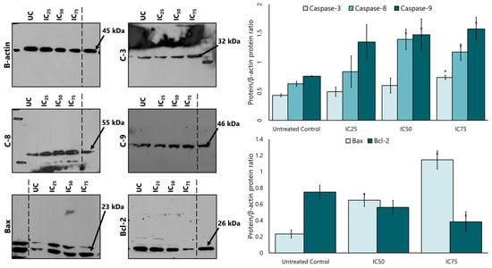 Protein expression of the apoptotic markers, caspase 3, caspase 8, caspase 9, Bax, and Bcl-2, was quantified using the Western blot technique [44]. MCF-7 cells were seeded in a 6-well plate at a density of 20,000 cells/well and incubated for 24 h. The LP extracts were treated in three different concentrations: IC25 (105.48 µg/mL), IC50 (91.19 µg/mL), and IC75 (71.16 µg/mL) for 16 h. The untreated well was considered as a negative control. The preparation of cell lysates as sample loading and Western blot analysis was performed according to the procedures described by Ismail et al, with slight modifications [55,56].