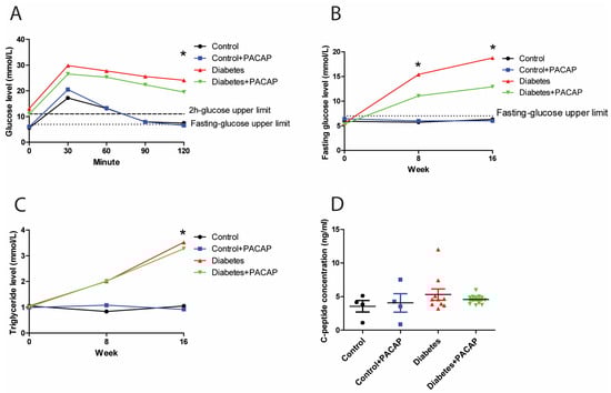 In the intraperitoneal glucose tolerance test, the 2 h glucose value of rats with diabetes (diabetes group and diabetes + PACAP group) was three times higher than in control rats (24.12 ± 2.2 mmol/L (diabetes) vs. 7.48 ± 0.31 mmol/L (control); 19.55 ± 2.32 mmol/L diabetes + PACAP) vs. 6.58 ± 0.34 mmol/L (control + PACAP)) (Figure 1A). Similarly, the fasting glucose level in the disease group exhibited a continuously elevating trend compared to the stability in normal ones. In the 8-week diabetic samples, the fasting glucose level was elevated to 15.43 ± 1.9 mmol/L (diabetes) vs. 5.73 ± 0.15 mmol/L in the control group, and, in the diabetes + PACAP group, to 11.05 ± 1.19 mmol/L, vs. 6 ± 0.27 mmol/L in the control + PACAP group. There is no significant difference between the diabetes and the diabetes + PACAP group at both the eighth and sixteenth week. (Figure 1B). At week 16, blood glucose levels showed a further increase in the diabetic groups compared to non-diabetic ones. Meanwhile, triglyceride levels were in line with the findings of the fasting glucose level (Figure 1C). Both the diabetes group and diabetes + PACAP group had significantly higher serum triglycerides than the control ones (3.52 ± 0.76 mmol/L (diabetes) vs. 1.05 ± 0.12 mmol/L (control); 3.28 ± 0.52 mmol/L (diabetes + PACAP) vs. 0.92 ± 0.05 mmol/L (control + PACAP). The C-peptide immunoassay, which confirmed the presence of the type 2 diabetes model, indicated that there was no statistical difference between the disease and normal ones (Figure 1D).