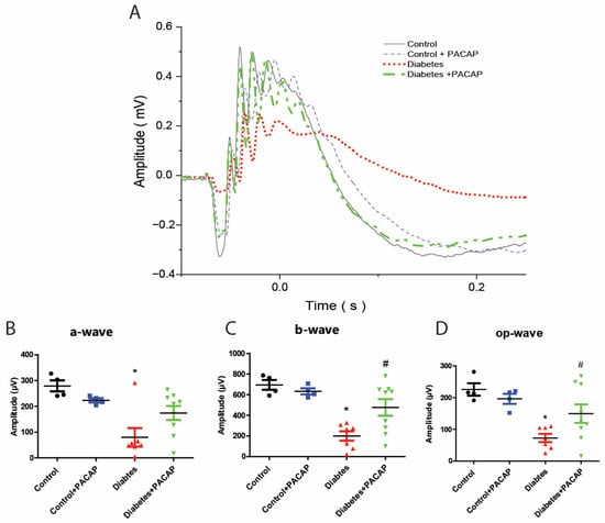 In contrast to diabetic rats, the diabetes + PACAP group had a more sensitive response in all amplitudes, like the a-wave (79.9 ± 13.59 µV (diabetes) vs. 174.23 ± 9.12 µV (diabetes + PACAP)), b-wave (200.08 ± 17.55 µV (diabetes) vs. 476.05 ± 26.69 µV (diabetes + PACAP)), and oscillatory potential waves (72.99 ± 4.89 µV (diabetes) vs. 149.75 ± 9.64 µV (diabetes + PACAP)) (Figure 2B–D).