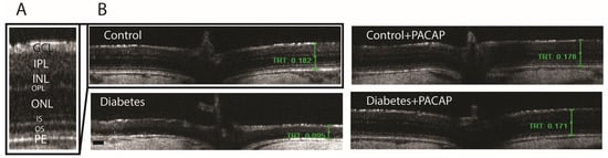 Histological effects of PACAP eye drops treatment. Representative OCT images comparing retinal thickness 16 weeks after STZ injection. (A) Magnified view of the retinal structure highlighting the different histological layers. (B) Representative cross-sectional B-scans from the control, control + PACAP, diabetes, and diabetes + PACAP groups, showing retinal thickness (mm). Abbreviations: PACAP: pituitary adenylate cyclase-activating polypeptide, GCL: ganglion cell layer; IPL: inner plexiform layer; INL: inner nuclear layer; OPL: outer plexiform layer; ONL: outer nuclear layer; IS: inner segment; OS: outer segment; PE: pigment epithelium; TRT: total retinal thickness. Scale bar: 100 µm.