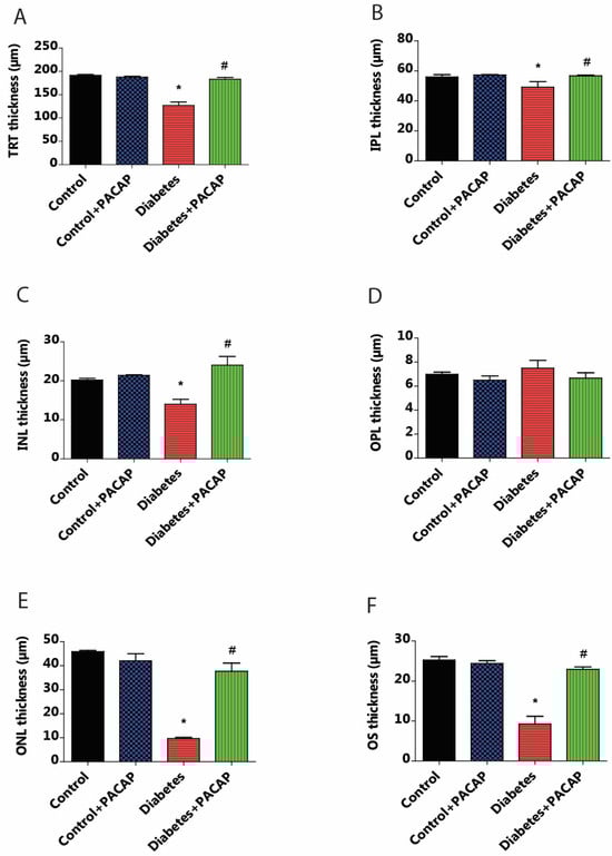 As compared to the diabetes group, the diabetes + PACAP group presented a different phenomenon: it was 50% thicker in TRT (127.05 ± 6.94 µm (diabetes) vs. 182.97 ± 4.15 µm (diabetes + PACAP)); there were also significantly higher values in the majority of nuclear layers, such as the INL thickness (13.95 ± 1.3 µm (diabetes) vs. 24.03 ± 2.22 µm (diabetes + PACAP)), ONL thickness (9.65 ± 0.52 µm (diabetes) vs. 37.67 ± 3.43 µm (diabetes + PACAP)), and OS thickness (9.22 ± 1.95 µm (diabetes) vs. 22.91 ± 0.65 µm (diabetes + PACAP)). Moreover, the inner plexiform layer (IPL) showed a significant difference (49.01 ± 3.91 µm (diabetes) vs. 56.63 ± 0.56 µm (diabetes + PACAP)). Interestingly, the outer plexiform layer (OPL) in the diabetic group (7.5 ± 0.65 µm) showed no significant difference compared to control (6.98 ± 0.18 µm) (Figure 4A–F).