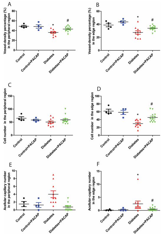 In contrast to the diabetes group, the percentage of vessel density from the diabetes + PACAP group presented higher in the peripheral area (36.08 ± 1.83% (diabetes) vs. 43.13 ± 1.55% (diabetes + PACAP)) and the edge region (27.43 ± 2.62% (diabetes) vs. 33.96 ± 1.12% (diabetes + PACAP)) (Figure 6A,B). Meanwhile, the number of pericytes in the diabetes + PACAP group also exhibited higher survival rates in both areas (periphery: 50.28 ± 4.51 (diabetes) vs. 60.12 ± 4.84 (diabetes + PACAP); edge: 29.98 ± 3.06 (diabetes) vs. 46.51 ± 3.54 (diabetes + PACAP)) (Figure 6C,D). In contrast, under diabetic circumstances, in acellular capillaries, no changes were detected in the PACAP-treated group (0.75 ± 0.08) than in the diabetes group (4.00 ± 0.27) in the peripheral area, while significance could be observed in the edge region (2.50 ± 0.35 (diabetes) vs. 0.46 ± 0.07 (diabetes + PACAP)) (Figure 6E,F).