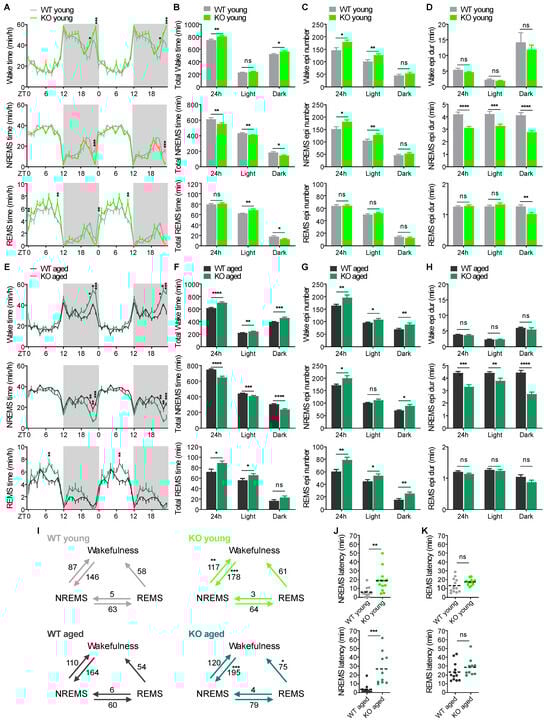 KO mice showed a more fragmented sleep–wake cycle compared to WT littermates at both ages. Specifically, young and aged KO mice had a significant increase in the overall episode number of both wake and NREMS (Figure 1C,G and Figure S1F,G), and shorter mean episode duration of NREMS (Figure 1D,H and Figure S1H,I). Aged KO mice also had more episodes of REMS (Figure 1G and Figure S1G) without an impact on their episode duration (Figure 1H and Figure S1I). Consistently, KO mice switched more often between sleep and wake states than WT littermates. There was a significant increase in the number of wake–NREMS and NREMS–wake transitions in young KO mice and wake–NREMS and REMS–wake transitions in aged KO mice (Figure 1I). KO mice exhibited a longer latency to NREMS after the onset of the light phase at both ages compared to WT littermates (Figure 1J), indicating a difficulty in initiating sleep. There was no significant difference in latency to REMS between genotypes (Figure 1K).
