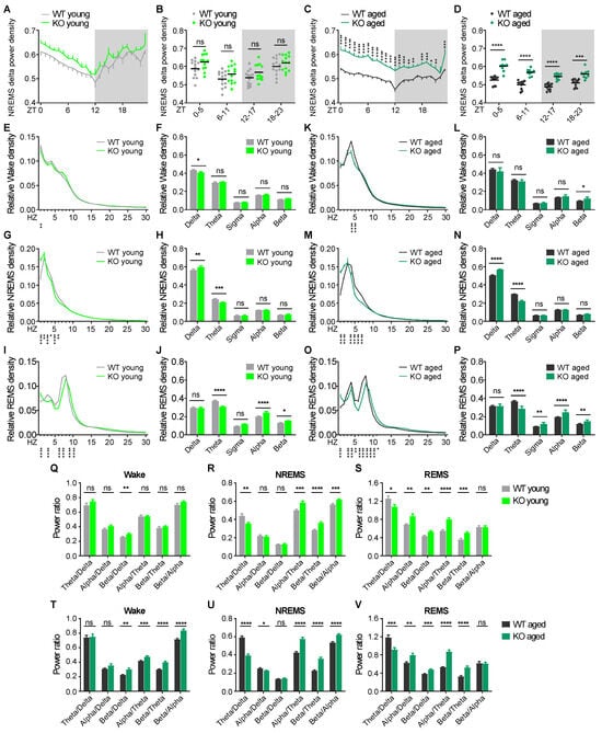 We first examined the diurnal pattern of NREMS delta (1–4 Hz) power density, a well-established electrophysiological marker of sleep need and a measure of synchrony of the neural network []. KO mice exhibited constitutively elevated NREMS delta power across the 24 h period at both ages (Figure 2A,D). These results suggest that KO mice do not have an intrinsic decreased sleep need, and the neural activity of KO mice in NREMS is hyper-synchronized. Next, we analyzed the EEG power spectra of KO and WT mice to detect difference across a wide range of frequencies (Figure 2E,P). During wakefulness, young KO mice exhibited decreased delta power, whereas age KO mice exhibited increased beta power and tended to have a reduction in delta power compared to WT littermates (p = 0.069) (Figure 2F,L). During NREMS, KO mice showed an increase in delta power and decrease in theta power (5–8 Hz) compared to WT littermates at both ages. The power in the sigma band (10–12 Hz), which corresponds to the frequency of sleep spindles in mice [], was similar between genotypes (Figure 2H,N). During REMS, EEG power spectra of KO mice were shifted toward higher frequencies at both ages (Figure 2I,O). KO mice had decreased power in theta, and increased power in alpha (9–14 Hz) and beta bands (15–30 Hz). Additionally, aged KO mice showed increased power in sigma band (Figure 2J,P). Similar changes in the EEG spectra of KO mice were observed in both light and dark phases (Figure S2).