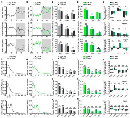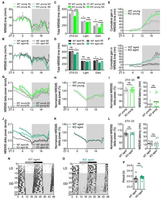 According to the “two-process” model of sleep regulation, sleep is regulated by homeostatic and circadian processes [,]. To assess the homeostatic modulation of sleep in KO mice, we sleep-deprived KO and WT mice for 4 h, starting at the onset of the light phase. After sleep deprivation (SD), KO and WT mice exhibited similar latency to enter NREMS at both ages (Figure 4M). Young and aged animals of the KO and WT groups showed homeostatic responses to SD, with increased NREMS and REMS and decreased wakefulness relative to time-matched baseline. This effect was most pronounced in the dark phase, possibly owing to a ceiling effect in the light phase (Figure 4A–D, Figure S4A,B,D,E). We calculated the cumulative gains in NREMS, REMS, and wakefulness from the corresponding baseline. KO mice gained more NREMS and lost more wakefulness compared to WT littermates at both ages by the end of recovery period. Young KO mice also gained more REMS (Figure 4E,F and Figure S4C,F). Changes in NREM EEG delta power were similar between KO and WT mice all over the recovery period at both ages, suggesting that KO mice accumulated sleep need similarly to WT mice (Figure 4G–L). These results suggest that homeostatic responses to SD in KO mice are intact. KO mice gained more recovery sleep, possibly due to their significantly reduced baseline sleep.