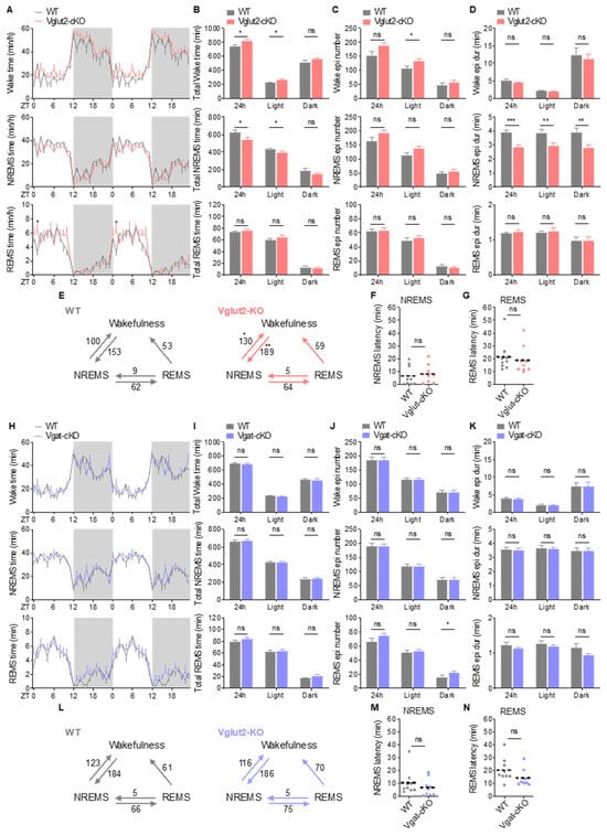 Similarly to constitutive KO mice, Vglut2-cKO mice exhibited increased duration of wakefulness, decreased NREMS amount, and comparable REMS amount relative to WT littermates (Figure 5A,B). The reduction in NREMS amount in Vglut2-cKO mice occurred across the 24 h cycle (Figure 5A). Vglut2-cKO mice showed a trend of increased episode number of wakefulness (p = 0.0539) and NREMS (p = 0.0786) (Figure 5C), whereas the average episode duration of NREMS was shorter in Vglut2-cKO mice than in WT littermates (Figure 5D). Consistently, Vglut2-cKO mice, like KO mice, showed increased transitions between NREMS and wakefulness relative to WT littermates (Figure 5E). These results indicate that Vglut2-cKO mutants replicate the sleep reduction and sleep fragmentation phenotypes observed in age-matched young KO mice. However, Vglut2-cKO mice did not show increased wakefulness and decreased NREMS amount before the light phase (Figure 5A) and had comparable NREMS and REMS latencies (Figure 5F,G) relative to WT littermates, suggesting that Vglut2-cKO mice did not experience pre-sleep arousal and difficulty in initiating sleep. In contrast to Vglut2-cKO mice, Vgat-cKO animals exhibited sleep patterns similar to those observed in WT littermates. There were no significant differences in sleep–wake amount, sleep architectures, transition between vigilance states, and NREMS and REMS latencies between two groups (Figure 5H–N).