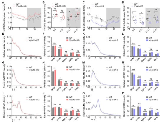Alterations in EEG spectral power in Vglut2-cKO and Vgat-cKO mice. (A,B) Mean NREMS delta power in every hour (A) and per 6 h block (B) in WT (n = 7) and Vglut2-cKO mice (n = 9). (C,D) Mean NREMS delta power in every hour (C) and per 6 h block (D) in WT (n = 9) and Vgat-cKO mice (n = 9). (E–J) EEG power spectra and frequency bands during wakefulness (E,F), NREMS (G,H), and REMS (I,J) in WT and Vglut2-cKO mice. (K–P) EEG power spectra and frequency bands during wakefulness (K,L), NREMS (M,N), and REMS (O,P) in WT and Vgat-cKO mice. Data are the mean ± SEM. Two-way repeated measures ANOVA with Sidak’s test (A–P). * p < 0.05; ** p < 0.01; *** p < 0.001; **** p < 0.0001. ns, not significant.