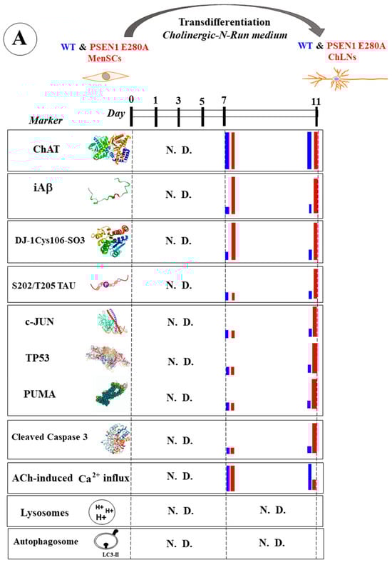 Schematic representation of wild-type (WT) and PSEN1 E280A menstrual stromal cell (MenSC) transdifferentiation into cholinergic-like neurons (ChLNs), appearance of neuropathologic markers, and effects of agents. (A) WT and PSEN1 ChLNs MenSCs were transdifferentiated into WT and PSEN1 E280A ChLNs in cholinergic N-Run (Ch-N-R) medium for 7 days and cultured in regular culture medium (RCm) for an additional 4 days. On days 7 and 11, markers (as listed) were evaluated in WT (blue bar) and PSEN1 E280A (red bar). N.D. = not determined. (B) WT and PSEN1 ChLNs were exposed to agents (purple letters represent reagent SP600125, CP55940, minocycline, sildenafil, epigallocatechin-3-gallate, melatonin) on day 7 (plus sign) and left in culture for 4 additional days. On day 11, untreated WT ChLNs (blue bar), ChLNs treated cells with agent only (green bar), untreated PSEN1 E280A ChLNs (red bar), or PSEN1 E280A ChLNs treated with agent (purple bar) were analyzed for different markers (as listed). N.D. = not determined.