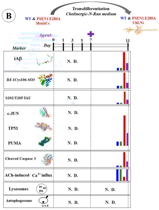 Several data suggest that neurodegeneration within the basal forebrain cholinergic cell group Ch4 of the nucleus basalis of Meynert (NbM), which projects to the cortex and amygdala, precedes and predicts both entorhinal and memory deficits []. Indeed, the preferential accumulation of Aβ and p-TAU has been shown in the NbM [,], which may contribute to the structural degeneration of the NbM []. In an effort to recapitulate the neuropathology of FAD in vitro, we established PSEN1 E280A cholinergic-like neurons (ChLNs) derived from umbilical cord Wharton’s jelly mesenchymal stromal cells (WJ-MSCs) using cholinergic-N-run medium (Ch-N-Rm) []. On day 7 of the transdifferentiation process, mutant ChLNs exhibited a pronounced accumulation of iAβ42 and oxidized DJ-1 (i.e., DJ-1C106-SO3), indicative of oxidative stress (OS), without any evidence of cell death []. However, by day 11, cholinergic mutant cells exhibited abnormal phosphorylation of the protein TAU (at S202/T205), apoptogenic-positive markers, such as tumor protein 53 (TP53), p-S63/S73 c-JUN, the p53-upregulated modulator of apoptosis (PUMA), cleaved caspase 3 (CC3), the loss of mitochondrial membrane potential (ΔΨm), and dysfunctional acetylcholine (ACh)-induced Ca2+ ion influx [] (Figure 1A). These observations suggest that iAβ not only induces p-TAU [,] but also triggers a series of signals that lead to neuronal dysfunction. The c-Jun N-terminal kinase (JNK) inhibitor SP600125 has been shown to reduce p-TAU []. Indeed, the accumulation of iAβ is associated with OS, and both phenomena precede p-TAU, apoptosis, and cholinergic dysfunction. Interestingly, in addition to the JNK inhibitor SP600125, the cannabinoid CP55940 [], minocycline [], sildenafil [], and epigallocatechin-3-gallate (EGCG) alone [] or in combination with melatonin [], added at day 7 of transdifferentiation, protected PSEN1 E280A ChLNs against Aβ toxic effects until day 11 (Figure 1B, all reagent mentioned are collectively referred as the Agent, letter in purple). However, further investigation is needed to determine the following: (i) whether the production and accumulation of iAβ starts at day 0 of the transdifferentiation of MenSCs towards the PSEN1 E280A cholinergic lineage (Figure 1A, N.D. = not determined); (ii) whether iAβ affects ALP or induces apoptosis at the MenSCs-ChLNs transition (Figure 1A, N.D.); or (iii) whether EGCG and tramiprosate (TM)—two anti-antioxidant/anti-Aβ aggregation agents [,,], RAP, VER, or CE—prevent iAβ-induced cell changes in MenSCs transitioning to PSEN1 E280A ChLNs (Figure 1B, N.D.).