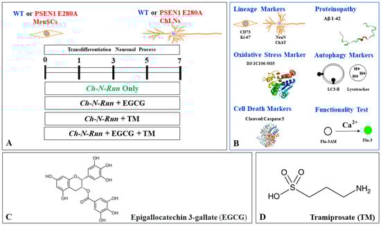 Schematic diagram of experimental procedure, biochemical analysis, chemical structure, and molecular formula of epigallocatechin-3-gallate (EGCG) and tramiprosate (TM). (A) PSEN1 E280A menstrual mesenchymal stromal cells (MenSCs) cultured in cholinergic-N-Run (Ch-N-R) medium for 0, 1, 3, 5, and 7 days transdifferentiated into cholinergic-like neurons (ChLNs). Reagents were added at day 0 (start transdifferentiation) and left in culture up to day 7. (B) ChLNs were then evaluated for lineage markers, including cluster of differentiation (CD) 73, proliferation marker Ki-67, neuronal nuclear antigen (NeuN), cholinergic lineage marker choline acetyltransferase (ChAT); proteinopathy of disease, accumulation of intracellular Aβ, oxidized DJ-1C106-SO3 as indication of generation of hydrogen peroxide (H2O2), oxidative stress (OS); autophagy markers LC3-phosphatidylethanolamine (LC3-II) conjugate as an indication of the presence of autophagosomes and LysoTracker as an indication of the presence of lysosomes; cell death markers (e.g., cleaved caspase 3 (CC3)); and functionality test acetylcholine-induced transient Ca2+ influx. (C) Epigallocatechin-3-gallate (EGCG); C22H18O11; [(2R,3R)-5,7-dihydroxy-2-(3,4,5-trihydroxyphenyl)-3,4-dihydro-2H-chromen-3-yl]3,4,5-trihydroxybenzoate; (D) tramiprosate (TM) or homotaurine; 3-aminopropane-1-sulfonic acid, C3H9NO3S.