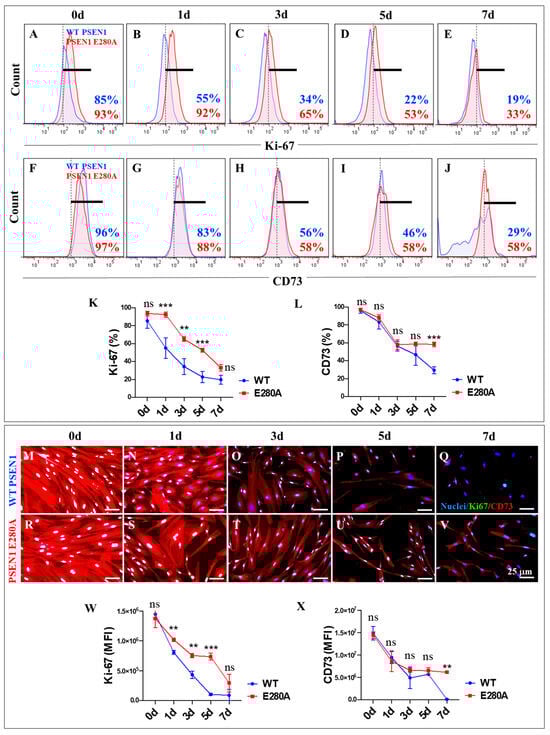 Flow cytometry and immunofluorescence analysis of proliferation marker Ki67 and cluster of differentiation 73 (CD73) during the process of transdifferentiation of menstrual mesenchymal stromal cells (MenSCs) into cholinergic-like neurons (ChLNs). Representative histograms showing Ki67 (A–E) and CD73 (F–J) flow cytometry analysis performed in wild-type (WT) PSEN1 (blue histograms) and E280A (red histograms) MenSCs after 0 (A,F), 1 (B,G), 3 (C,H), 5 (D,I), and 7 (E,J) days of culture in Ch-N-Rm. (K,L) Bar charts represent the quantitative analysis of the positive population. Representative images showing Ki67 (green) and CD73 (red) double-stained WT PSEN1 (M-Q) and E280A (R–V) MenSCs after 0 (M,R), 1 (N,S), 3 (O,T), 5 (P,U), and 7 (Q,V) days of culture in Ch-N-Rm. Nuclei were stained with Hoechst dye (blue; M–V). (W,X) Bar charts represent the mean fluorescent intensity (MFI) quantification of images obtained by immunofluorescence analysis. The histograms and images represent one out of three independent experiments. Significant values were determined by two-way ANOVA with a Tukey post hoc test; ** p < 0.01, *** p < 0.001 intergroup comparison; n.s. = not significant. Image magnification 20×.
