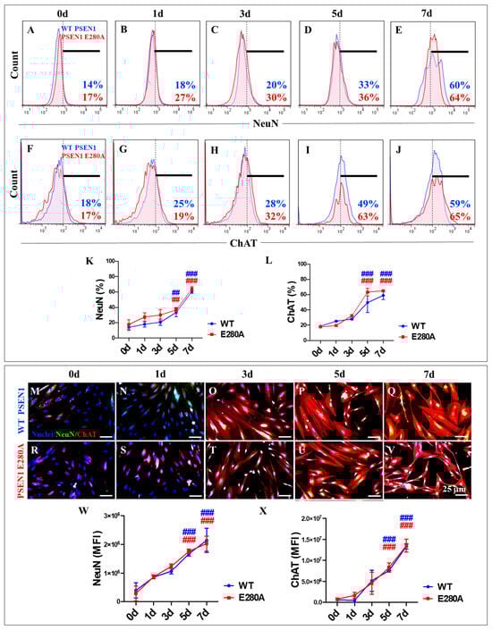 Furthermore, our statistical analysis revealed no significant differences in the expression levels of the neuronal marker NeuN (Figure 4A–E) and the cholinergic marker ChAT (Figure 4F–J) in WT and PSEN1 E280A cells during the transdifferentiation process (Figure 4K,L). These results were confirmed by fluorescence microscopy analysis (Figure 4M,X).