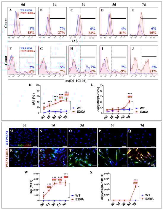 Next, the time course of iAβ accumulation and the presence of oxDJ-1 were examined as evidence of oxidative stress (OS) from day 0 to day 7 in the transdifferentiation of MenSCs into ChLNs. To this end, wild-type (WT) and PSEN1 E280A MenSCs were cultured in Ch-N-Run medium (Figure 2A) and analyzed for proteinopathy and oxidized DJ-1 markers on days 0, 1, 3, 5, and 7 (Figure 2B). As shown in Figure 5, flow cytometry analysis revealed that wild-type PSEN1 cells exhibited a consistent low basal accumulation of iAβ over the course of the study, whereas mutant PSEN1 cells induced a steady, time-dependent increase in iAβ (Figure 5A–E,K). Overall, PSEN1 E280A increased iAβ accumulation by +155% from day 0 to day 7. Notably, a significant accumulation of iAβ (+1700%) was detected in PSEN1 E280A MenSCs at day 0 compared to WT MenSCs (Figure 5A,K). We found that both WT and PSEN1 E280A cells exhibited a basal level of oxidized DJ-1 up to day 5 (Figure 5F–J,L), whereas a sudden increase of +250% in oxidized DJ-1 was detected in PSEN1 E280A ChLNs at day 7 (Figure 5J,L). These observations were confirmed by the subsequent analysis of the samples by fluorescence microscopy (Figure 5M–X).