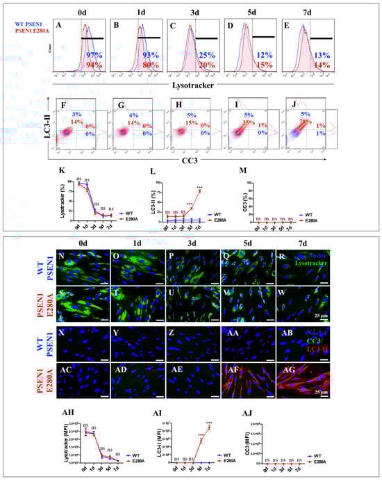 The autophagy–lysosomal pathway (ALP) is thought to be impaired during the earliest intraneuronal stage of Alzheimer’s disease (AD) []. Given the ability to monitor ALP using markers such as LC3-II and the lysosomal marker LysoTracker®, we investigated the effect of PSEN1 E280A-induced iAβ on ALP in mutant ChLNs during their transdifferentiation from MenSCs to ChLNs. As shown in Figure 5, lysosomes decreased in a time-dependent manner in both WT and PSEN1 E280A cells (Figure 6A–E). The accumulation of lysosomes (>90% LysoTracker®-positive cells) decreased significantly from day 2 to day 3 by ~−76% and then remained almost constant until day 7 (Figure 6K). Conversely, autophagosome accumulation remained unperturbed until day 3 (3% and 14% LC3-II-positive cells in WT and PSEN1 E280A cells, respectively) but steadily increased by +133% and +426% on days 5 and 7, respectively, in PSEN1 E280A cells only (Figure 6F–J,L). No CC3-positive cells were detected at any time point in either WT PSEN1 or PSEN1 E280A cells (Figure 6F–J,M). Similar results were obtained by fluorescence microscopy analysis (Figure 6N–AJ).