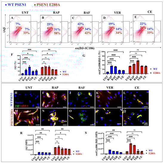 In the context of exploring therapeutic targets against iAβ accumulation, RAP, the autophagy inhibitor bafilomycin A1 (BAF) used as a control, verubecestat (VER), and compound E (CE) were evaluated. WT and PSEN1 MenSCs were exposed to these reagents in Ch-N-Run media from day 0 to day 7 (Figure 2A). Flow cytometric analysis revealed that untreated PSEN1 E280A cells exhibited a significant increase in iAβ (+428%). Treatment with these reagents differentially affected both WT and mutant ChLNs. RAP, BAF, VER, and CE induced a significant increase in iAβ by +257% (Figure 7B), +500% (Figure 7C), +171% (Figure 7D), and +214% (Figure 7E), respectively, in WT ChLNs (Figure 7F). Similarly, an analysis of oXDJ-1 shows that PSEN1 E280A ChLNs intrinsically exhibited a significant increase in oXDJ-1 of +371% (Figure 7A) compared to WT ChLNs (Figure 7G). RAP, BAF, VER, and CE induced a significant increase in oxDJ-1 of +342% (Figure 7B), +385% (Figure 7C), +100% (Figure 7D), and 100% (Figure 7E), respectively, in treated WT ChLNs compared to untreated WT ChLNs (Figure 7G). When mutant ChLNs were treated with RAP and BAF reagents, the results showed that these reagents significantly increased oxDJ-1 by +76% (Figure 7B,G) and +27% (Figure 7C,G), respectively, in mutant cells, whereas VER and CE did not induce significant changes in oxDJ-1 in PSEN1 E280A (Figure 7G). Fluorescence microscopy analysis showed similar results (Figure 7H–S).