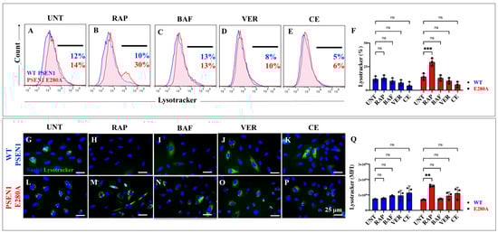 We next examined whether RAP, VER, and CE induced changes in lysosomal acidification in ChLNs. Figure 8A shows that there were no statistical differences between untreated WT and untreated PSEN1 E280A ChLNs (Figure 8A,F). Upon RAP treatment, PSEN1 E280A ChLNs significantly increased lysosomal acidification by +200% compared to WT ChLNs (Figure 8B,F). In contrast, BAF, VER, and CE show no significant changes in lysosomal signaling in both WT and mutant neuronal cells (Figure 8C–F). Similar observations were obtained by immunofluorescence microscopy analysis (Figure 8G–Q).