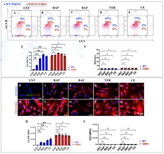 As an additional analysis of the autophagy system, we examined autophagosomes in WT and PSEN1 E280A ChLNs. Figure 9 shows that untreated mutant ChLNs exhibited an abnormal accumulation of autophagosomes (LC3-II-positive cells) by +1925% compared to untreated WT ChLNs (Figure 9A,F). RAP, BAF, VER, and CE differentially affected phagosome organelles in both WT and mutant cells. While RAP, BAF, VER, and CE increased phagosome accumulation in WT ChLNs by +575% (Figure 9B), +1525% (Figure 9C), +2075% (Figure 9D), and +1825% (Figure 9E), respectively (Figure 9F), no significant changes in autophagosome accumulation were observed in PSEN1 E280A ChLNs (Figure 9B–F). Notably, no significant changes in CC3 were observed in WT or PSEN1 E280A ChLNs in response to these reagents (Figure 9B–E,G). Similar results were obtained by fluorescence microscopy analysis (Figure 9H–S).