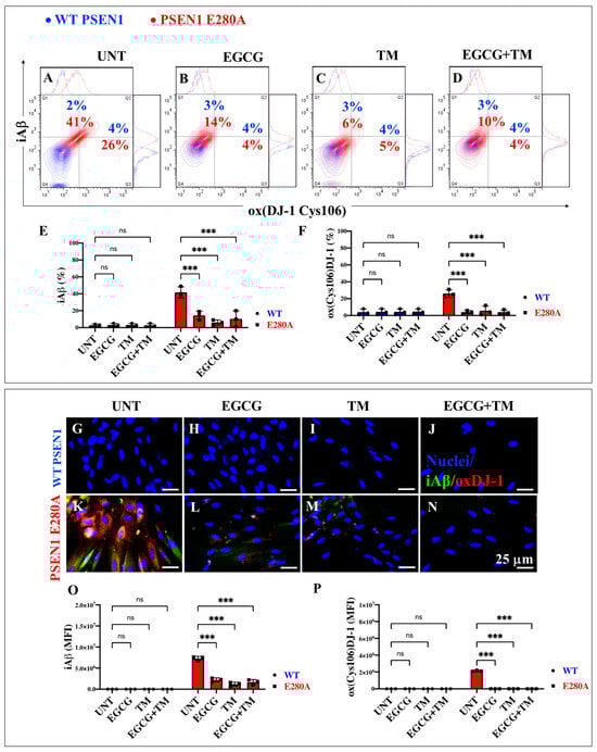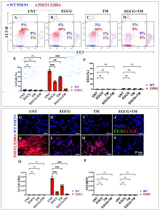 The above observations prompted us to investigate whether the anti-amyloid and antioxidant agents epigallocatechin-3-gallate (EGCG, Figure 2C) and tramiprosate (TM, Figure 2D) alter the pathological phenotype in PSEN1 E280A ChLNs. To this end, wild-type (WT) and PSEN1 cells were exposed to EGCG and TM alone or in combination in Ch-N-Run media from day 0 (MenSCs) to day 7 (Figure 2A). As shown in the previous section, PSEN1 E280A ChLNs exhibited the characteristic FAD pathological phenotype within approximately 7 days of transdifferentiation, characterized by substantial accumulation of iAβ accompanied by the oxidation of DJ-1 (Figure 10A), basal lysosomal signal (Figure 11A), and the aberrant accumulation of autosomes in the absence of CC3 (Figure 12A), compared to untreated WT ChLNs. Investigation revealed that neither EGCG nor TM alone or in combination affected any of the variables tested, including iAβ and oxDJ-1, lysosomal signaling, autophagosomes, or CC3 in wild-type ChLNs (Figure 10B–F, Figure 11B–E, Figure 12B–F). Conversely, both reagents alone or in combination were highly effective in reducing these variables in mutant ChLNs. As shown in Figure 10, EGCG, TM, and EGCG/TM reduced iAβ by −66% (Figure 10B), −85% (Figure 10C), and −76% (Figure 10D), respectively, in PSEN1 E280A ChLNs compared to untreated mutant ChLNs (Figure 10E). Similarly, EGCG, TM, or TM/EGCG reduced the levels of oxidized DJ-1 by −84% (Figure 10B–D) for all treatments in mutant cells compared to untreated mutant ChLNs (Figure 10F). Although EGCG and TM alone or in combination did not affect lysosome signals in wild-type and mutant ChLNs (Figure 11A–E), both reagents were able to reduce the aberrant accumulation of autophagosomes. As shown in Figure 12, EGCG, TM, or EGCG/TM reduced autophagosome accumulation in PSEN1 E280A ChLNs by −53% (Figure 12B), −29% (Figure 12C), and 91% (Figure 12D), respectively, compared to untreated mutant ChLNs (Figure 12E). Furthermore, the combination of EGCG and TM exhibited a significantly more pronounced effect in blunting the LC3-II signal compared to EGCG and TM administered individually (p < 0.001). In summary, the effects observed for EGCG and TM on both WT and mutant ChLNs were consistent when analyzed by fluorescence microscopy (Figure 10G–P, Figure 11F–N and Figure 12G–P).
