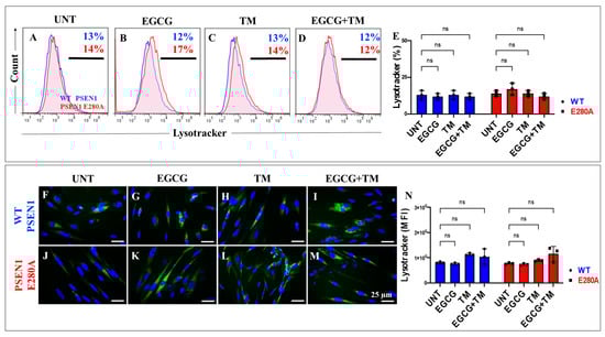 Flow cytometry and fluorescence microscopy analysis of lysosome acidification during the process of transdifferentiation of menstrual mesenchymal stromal cells (MenSCs) into cholinergic-like neurons (ChLNs) treated with (−)-epigallocatechin-3-gallate (EGCG) and tramiprosate (TM) alone or in combination. Representative histograms (A–D) showing LysoTracker flow cytometry analysis performed after 7 days in WT PSEN1 (blue histograms) and E280A (red histograms) ChLNs untreated (UNT) (A) or treated with 25 μM EGCG (B) and 50 μM TM (C) alone or in combination (D). (E) Bar chart represents the quantitative analysis of the positive population. Representative images showing LysoTracker (green)-positive WT PSEN1 (F–I) and E280A (J–M) ChLNs untreated (UNT) (F,J) or treated with EGCG (G,K) and TM (H,L) alone or in combination (I,M). Nuclei were stained with Hoechst dye (blue; F–M). (N) Bar chart represents the mean fluorescent intensity (MFI) quantification of images obtained by fluorescence microscopy analysis. The histograms and images represent one out of three independent experiments. Significant values were determined by two-way ANOVA with a Tukey post hoc test. n.s. = not significant. Image magnification 20×.