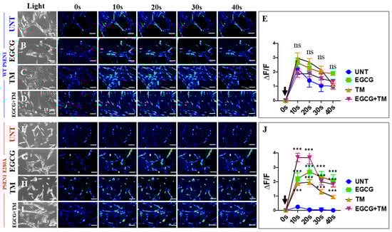 Previous studies have shown that PSEN1 E280A ChLNs are unresponsive to ACh-induced Ca2+ influx []. Therefore, we investigated whether EGCG and TM, either individually or in combination, could ameliorate the aberrant response of PSEN1 E280A to ACh stimuli. As shown in Figure 13, WT ChLNs enhanced the transient Ca2+ influx response to ACh (mean fluorescence change (ΔF/F) = 2.25 ± 0.42 and mean duration of 10 s each (n = 20 ChLN cells imaged, N = 3 dishes)) (Figure 13A,E). Conversely, PSEN1 E280A ChLNs showed no response to ACh stimulation (mean fluorescence change (ΔF/F) = 0.24 ± 0.09, mean duration of 10 s each (n = 20 ChLN cells imaged, N = 3 dishes)) (Figure 13F,J). When exposed to ACh and reagents, WT and PSEN1 E280A ChLNs showed different responses to ACh stimuli and reagents. No statistical difference was observed between the ACh-induced Ca2+ influx in the presence of EGCG (Figure 13B, ΔF/F = 2.65 ± 0.42) or TM (Figure 13C, ΔF/F = 2.97 ± 0.36) and EGCG plus TM (Figure 13D, ΔF/F = 1.87 ± 0.24) and untreated WT ChLNs (mean duration of 10 s each, Figure 13E) in intergroup and intragroup comparisons. Notably, the co-treatment of ACh with EGCG (Figure 13G, ΔF/F = 2.22 ± 0.39), TM (Figure 13H, ΔF/F = 1.89 ± 0.15), and the combination of EGCG and TM (Figure 13I, ΔF/F = 3.68 ± 0.29) dramatically increased the Ca2+ ion influx in PSEN1 E280A compared to untreated mutant ChLNs (mean duration of 10 s each, Figure 13J), albeit to different extents. The strongest effect on ACh-induced Ca2+ influx was observed with the co-treatment of combined EGCG and TM (Figure 13J), followed by a similar effect on cells treated with EGCG or TM alone (Figure 13J).