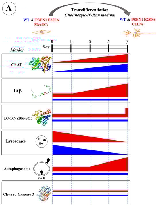 To the best of our knowledge, this study is the first to investigate the development of PSEN1 E280A MenSCs-derived ChLNs in association with the kinetics of the accumulation of iAβ the ALP and other pathological markers up to day 7 to better understand the pathogenic mechanism of the development, progression, and resolution of FAD []. The study showed that PSEN1 E280A delayed the proliferative capacity of MenSCs without affecting their transdifferentiation into ChLNs. Consequently, a decrease in the proliferative marker Ki-67 and the disappearance of the mesenchymal marker CD73 were detected in MenSCs during their transition to PSEN1 E280A ChLNs. Notably, the expression levels of NeuN and ChAT remained unchanged in both WT and mutant ChLNs. These observations suggest that the PSEN1 E280A mutation does not affect the development of MenSCs into ChLNs. Notably, this study provides novel evidence that PSEN1 E280A induces a steady, time-dependent increase in the accumulation of iAβ from MenSCs to ChLNs, suggesting that the PSEN1 aspartyl protease is active in MenSCs and that its loss of function caused by mutations, e.g., E280A, impairs enzymatic activity during early cell development and differentiation [,].