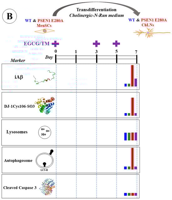 (A) Schematic representation of the transdifferentiation of wild-type (WT) and PSEN1 E280A mesenchymal stromal cells (MenSCs) into cholinergic-like neurons (ChLNs) cultured in cholinergic-N-Run medium up to day 7 and major neuropathologic markers. (B) Schematic representation of WT and PSEN1 E280A MenSCs-derived ChLNs treated with a combination of epigallocatechin-3-gallate (EGCG) and tramiprosate (TM) at days 0, 3, and 5. Evaluation of markers were performed at day 7. Blue color bar represents untreated WT ChLNs, green color bar represents WT treated with combined EGCG/TM, red color bar represents untreated PSEN1 E280A, and purple color bar represents PSEN 1 E280A cells treated with combined EGCG/TM.