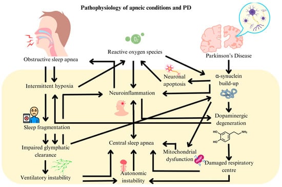 Several mechanisms have been postulated to link OSA and PD. Intermittent hypoxia (IH) induced by OSA promotes oxidative stress, inflammation, and neuronal apoptosis []. This process involves reactive oxygen species (e.g., superoxide and hydrogen peroxide), which damage neurons and trigger the release of pro-inflammatory cytokines like TNF-α, IL-1β, and IL-6 []. These molecular alterations were thought to promote α-synuclein accumulation in the substantia nigra by influencing its oligomerization and fibril formation.