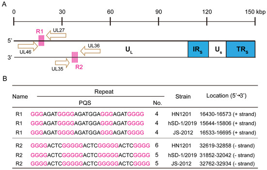 The PRV genome is characterized by a high GC content (68–74%) and contains various repetitive DNA sequences [49]. We aimed to investigate the distribution of putative quadruplex sequences (PQS) within the PRV genome. To predict G4 formation, we employed the QGRS Mapper online tool [50] (https://bioinformatics.ramapo.edu/QGRS/index.php, accessed on 15 December 2023), setting the guanine repeat number to 3 and varying the loop length from 1 to 11 nucleotides. Notably, we identified two repeat regions in the UL region of the PRV genome, composed of G4-forming sequences arranged in a tandem manner. One of these repeated G4 regions, located on the sense strand (+), consisted of the G4 sequence 5′-GGGGAGAGGGGAGACGAGAGGGGAGAGGGG, which we designated as R1-PQS. The R1-PQS repeat region is located between the UL46 and UL27 genes and is situated on the template strand for UL27 transcription. In addition, for the HN1201 strain, this repeat region consists of four repeated PQS sequences. The other repeated G4 region, located on the antisense strand (−), consisted of the G4 sequence 5′-GGGGACTCGGGGGACTCGGGGGACTCGGGG, which we termed R2-PQS. The R2-PQS repeat region is located between the UL35 and UL36 genes and is situated on the template strand for UL35 transcription. For the HN1201 strain, this repeat region consists of six repeated PQS sequences. Furthermore, these two repeat regions were highly conserved across three representative PRV variants: HN1201, JS-2012, and hSD-1/2019 (Figure 1A,B). The sequences of the repeated G4s are provided in Table S1, highlighted in yellow.