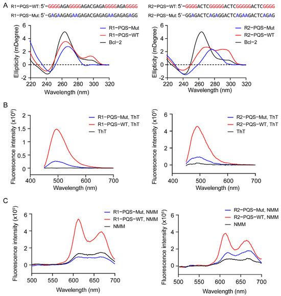The CD spectroscopy has been widely used to identify G4 formation and determine G4 conformations [51]. R1-PQS and R2-PQS were annealed in a buffer containing 50 mM K+ and subjected to CD analysis. Both oligonucleotides displayed a negative peak at 240 nm, a positive peak at 264 nm, and another positive peak at 294 nm, which are characteristic of a hybrid G4 structure. These spectral features were similar to those observed in the well-studied hybrid G4 structure of Bcl-2 [52]. However, when the core guanine residues were mutated to adenine to disrupt G4 formation, the CD signature was lost in both the negative controls, R1-PQS-Mut and R2-PQS-Mut (Figure 2A). To further corroborate G4 formation in R1-PQS and R2-PQS, a fluorescence turn-on assay was performed using the fluorescent probes ThT and NMM, which enhance fluorescence emission upon binding to G4 structures [53,54,55]. As expected, compared to the negative controls, both ThT and NMM showed significantly increased fluorescence intensity when incubated with annealed R1-PQS and R2-PQS (Figure 2B,C).