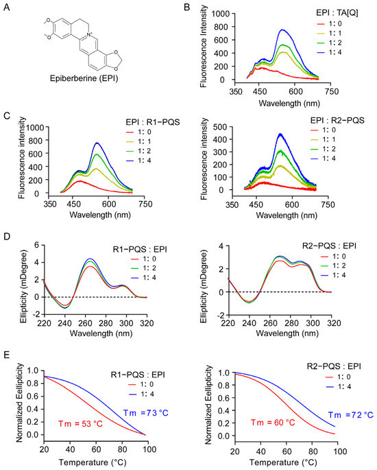 Epiberberine binding and stabilization of G-quadruplexes formed by R1-PQS and R2-PQS. (A) Molecular structure of EPI. (B,C) The telomeric sequence (TA[Q]) was used as a positive control. G4 formation was assessed by fluorescence after incubation of R1-PQS, R2-PQS, and TA[Q] with EPI. (D) The structural changes of R1-PQS and R2-PQS upon EPI binding were analyzed by CD spectroscopy. (E) The thermal stability of R1-PQS and R2-PQS with EPI binding was evaluated by CD melting curves, with the melting temperature (Tm) determined by fitting the data to a sigmoidal curve using the Boltzmann function.