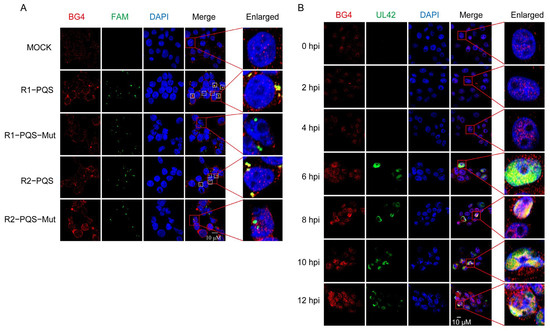 To further confirm that the PRV genome forms G4 structures in cells, we infected PK-15 cells with PRV-HN1201. The PRV UL42 protein, a DNA polymerase processivity factor essential for viral replication [58], was used as an indicator of viral genome replication. As shown in Figure 4B, the expression of UL42 increased over time, particularly at 6, 8, 10, and 12 h post-infection (hpi), and localized to the cell nucleus. This result suggests that the PRV genome undergoes replication within the nucleus during these time points. Notably, significant co-localization of BG4 and UL42 (yellow fluorescence signal) was observed, supporting the conclusion that G4 structures are formed during the replication of the PRV genome.