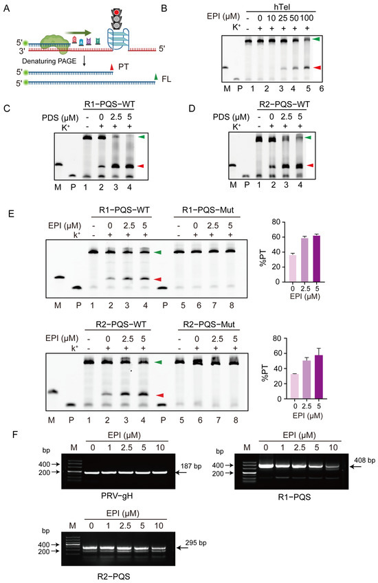 EPI inhibits DNA replication by targeting G4 structures formed by R1-PQS and R2-PQS. (A) Schematic of the Taq polymerase stop assay showing premature termination products (red arrows) due to G4-induced steric hindrance. Green arrows indicate the full-length products synthesized by Taq polymerase. (B) Primer extension with telomeric sequence (positive control) and varying concentrations of EPI to assess its effect on DNA replication. (C,D) Positive control using PDS, a G4 stabilizer, in the Taq polymerase stop assay. (E) Primer extension assays on wild-type and mutant R1-PQS and R2-PQS sequences with varying EPI concentrations. (F) PCR amplification of the PRV-HN1201 genome to assess G4 formation in the R1-PQS and R2-PQS regions upon EPI treatment. In (B,E), “−” indicates the absence of both K⁺ and EPI. In (C,D), “−” indicates the absence of both K⁺ and PDS. “+” indicates the presence of K⁺.
