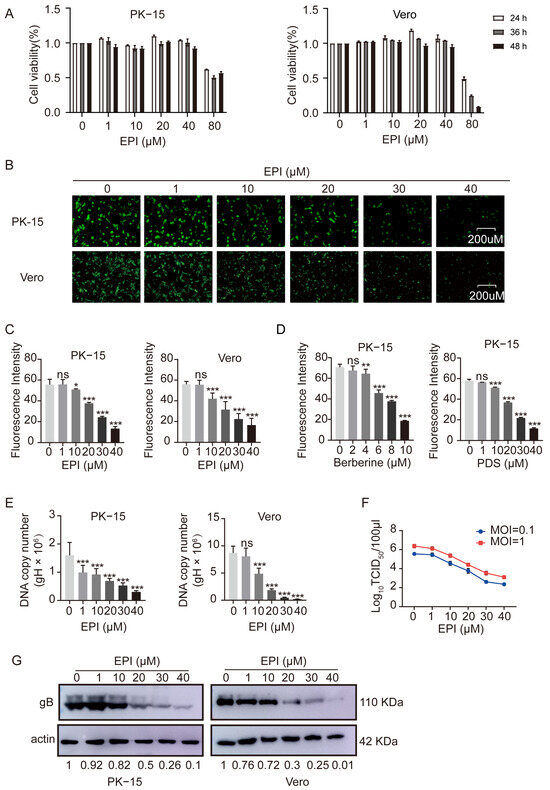 To determine whether EPI affects PRV proliferation in live cells, we first evaluated the cytotoxicity of EPI on both PK-15 and Vero cells using the CCK-8 assay. The results showed that EPI concentrations below 40 µM did not significantly affect cell viability. However, at 80 µM, cell viability decreased to approximately 50% (Figure 6A). Based on these findings, we limited the maximum EPI concentration to 40 µM for subsequent experiments.