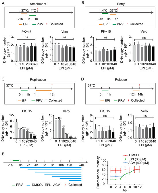 Given that PRV infection in cells generally involves adsorption, invasion, replication, and release phases, we sought to determine at which stage EPI impacts PRV proliferation. As shown in Figure 7A–D, EPI primarily affects the replication phase of PRV within cells, with no significant impact on viral adsorption, invasion, or release. To further confirm this observation, we conducted a time-of-addition assay. EPI was added at different times post-infection at a concentration of 30 µM. Compared to the DMSO control, EPI significantly inhibited PRV gene copy number starting at 8 h post-infection, corresponding to the time when PRV replication occurs in cells. This effect was similar to that observed with the antiviral drug acyclovir (ACV) (Figure 7E), which is known to primarily target the replication process of PRV in cells.